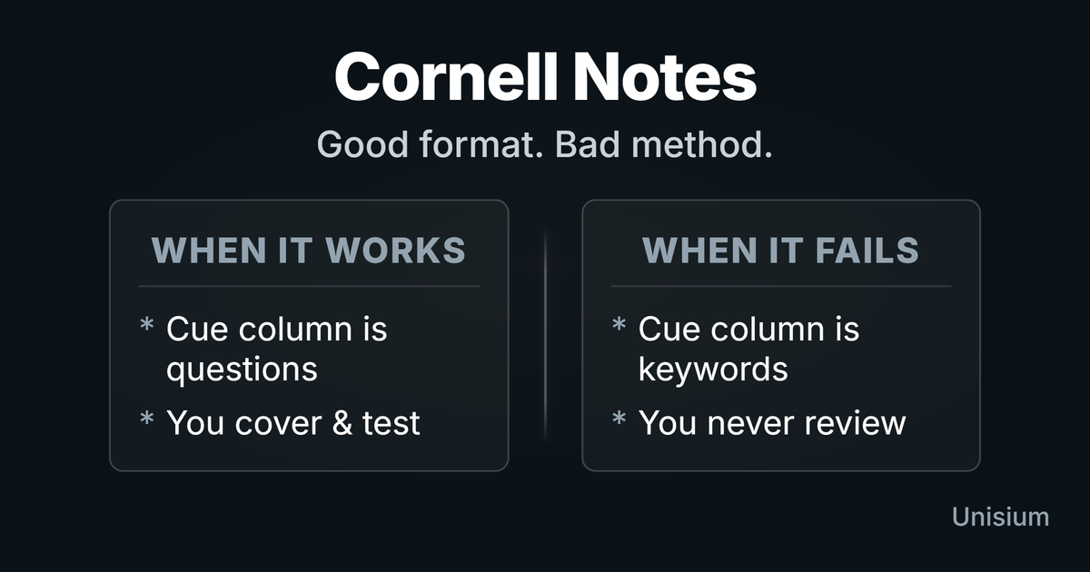Are Cornell Notes effective? Better than standard notes, but still passive unless you use the cue column for retrieval and the summary for elaboration.