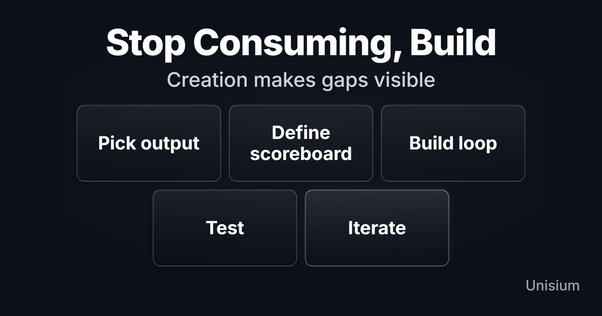 After studying math and physics, the next move is creation: build something that depends on the ideas (a model, tool, experiment, or product). Consumption has diminishing returns because it avoids decisions and hides gaps, while building creates tight feedback under real constraints. In the Unisium Study System, this is the bridge from studying well to producing real outputs.