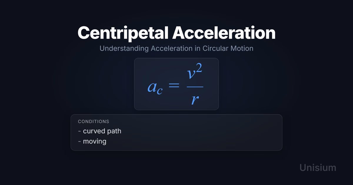Centripetal acceleration is the acceleration directed toward the center of curvature when an object moves along a curved path. It applies when an object is moving along a curved trajectory, and its magnitude depends on speed and radius of curvature. Mastering it requires elaboration, retrieval practice, self-explanation, and problem solving—core strategies in the Unisium Study System.