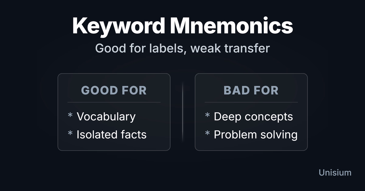 Keyword mnemonics pair a new term with a familiar-sounding keyword and a vivid image to cue recall. They can help with labels and arbitrary definitions, but they don’t build the relational structure you need to choose principles, set up models, and solve problems in math and physics. Use them sparingly for vocabulary, then move quickly to self-explanation, retrieval practice, and worked problem solving to make the idea usable.