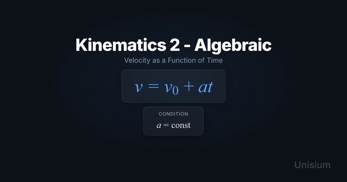 Kinematics 2 - Algebraic gives velocity as a function of time under constant acceleration: . It applies over any interval where acceleration stays constant, and it lets you solve for , , or when the other two are known. In the Unisium Study System, you learn it by elaborating the meaning, retrieving it from memory, and explaining worked examples before solving problems.
