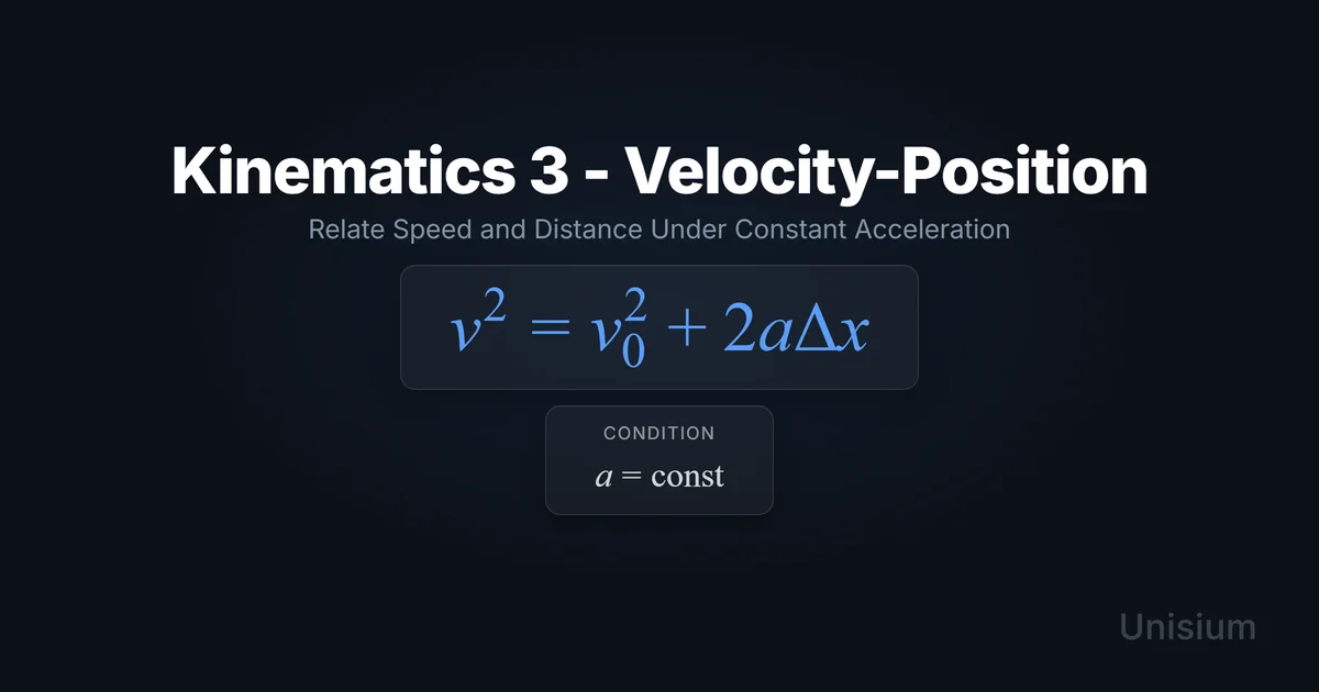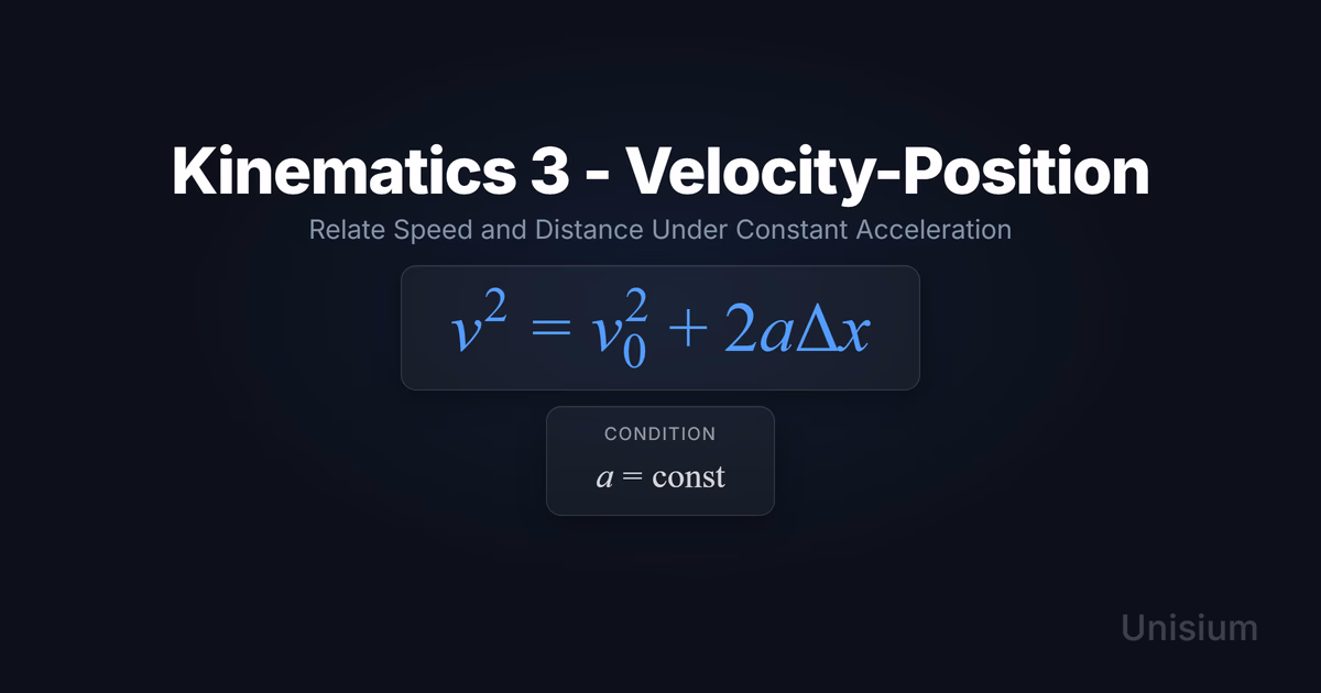 Kinematics 3 (Velocity-Position) relates an object’s velocity to its displacement under constant acceleration: . Use it when time is unknown or irrelevant, but you know (or want) , , , and . Mastering it requires elaboration, retrieval practice, self-explanation, and problem solving—core strategies in the Unisium Study System.