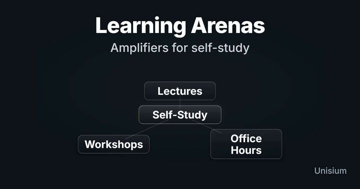 The right way to think about learning arenas is simple: your self-study loop (Elaborative Encoding, Retrieval Practice, Self-Explanation, Problem Solving) does the heavy lifting. Lectures, workshops, office hours, and peers exist to amplify that loop: