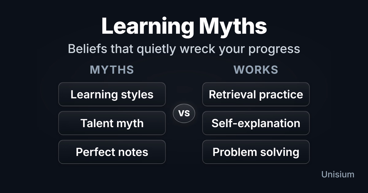 Unisium is built to counter these myths by default: you answer first, you explain your reasoning, and you practice solving, then revisit what matters over time. That’s the Unisium Study System implemented as short sessions with feedback and spacing, so you build competence you can reproduce under exam pressure. Ready to try it? Start learning with Unisium or explore the full framework in Masterful Learning.