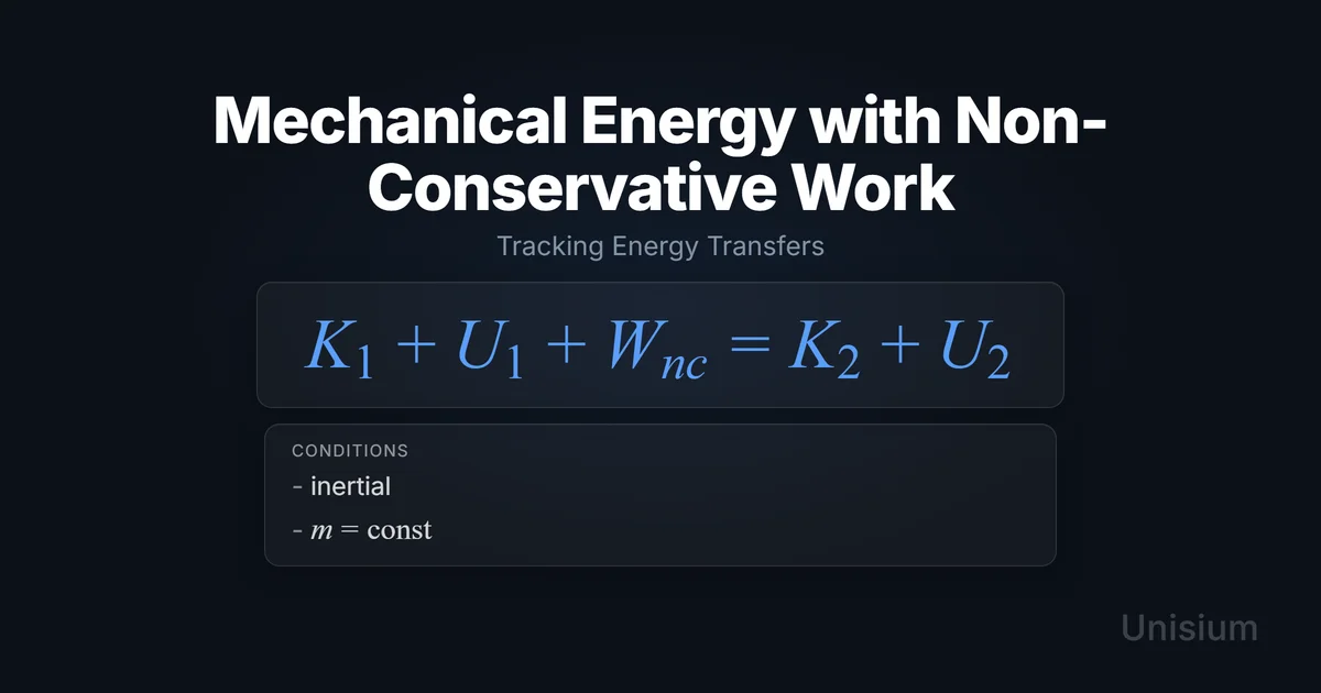 Mechanical Energy with Non-Conservative Work states that the total mechanical energy (kinetic plus potential) of a system changes by the amount of work done by non-conservative forces. It applies in non-relativistic mechanics in an inertial frame when forces like friction, drag, or applied pushes transfer energy into or out of the mechanical energy pool. Mastering it requires elaboration, retrieval practice, self-explanation, and problem solving—core strategies in the Unisium Study System.