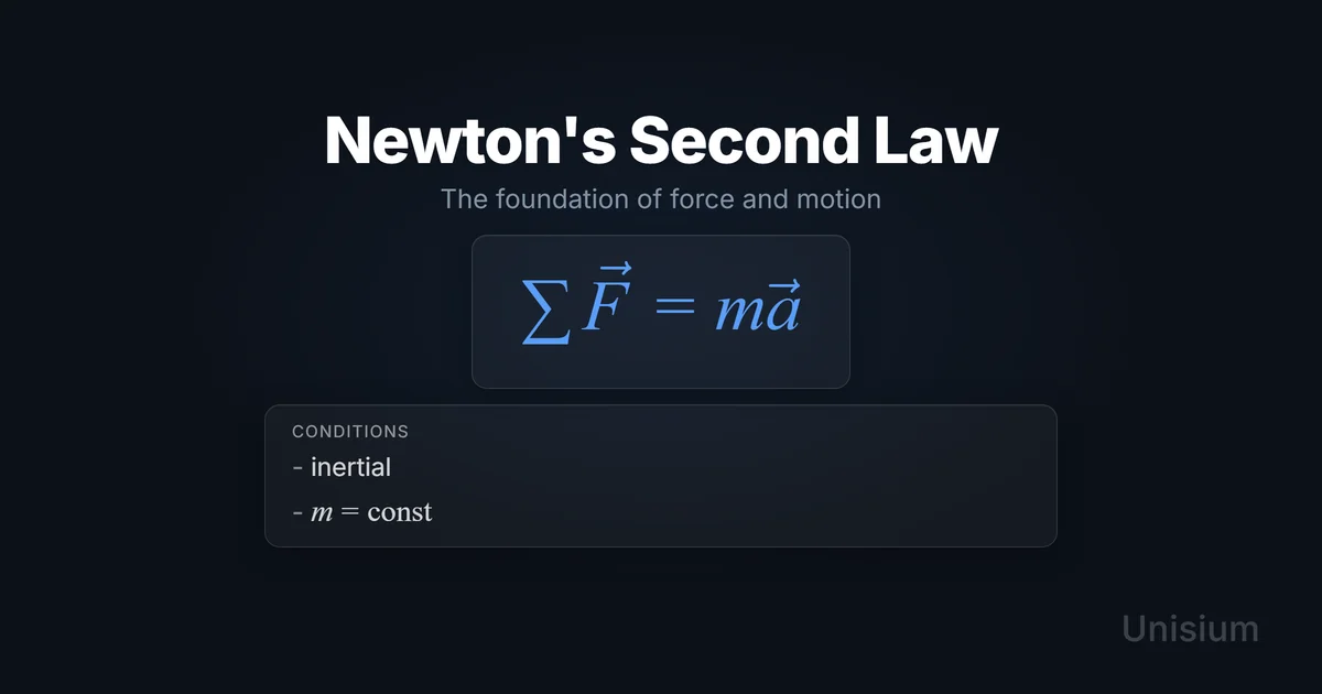 Newton’s Second Law is a representational principle in Unisium—a fundamental equation that connects observable quantities (forces, mass, acceleration). When you solve a mechanics problem in Unisium, the app tracks whether you’ve identified the correct representational principle for the situation. Mastering this law means more than memorizing —it means knowing when it applies, how to set up free-body diagrams, and why the vector nature matters.