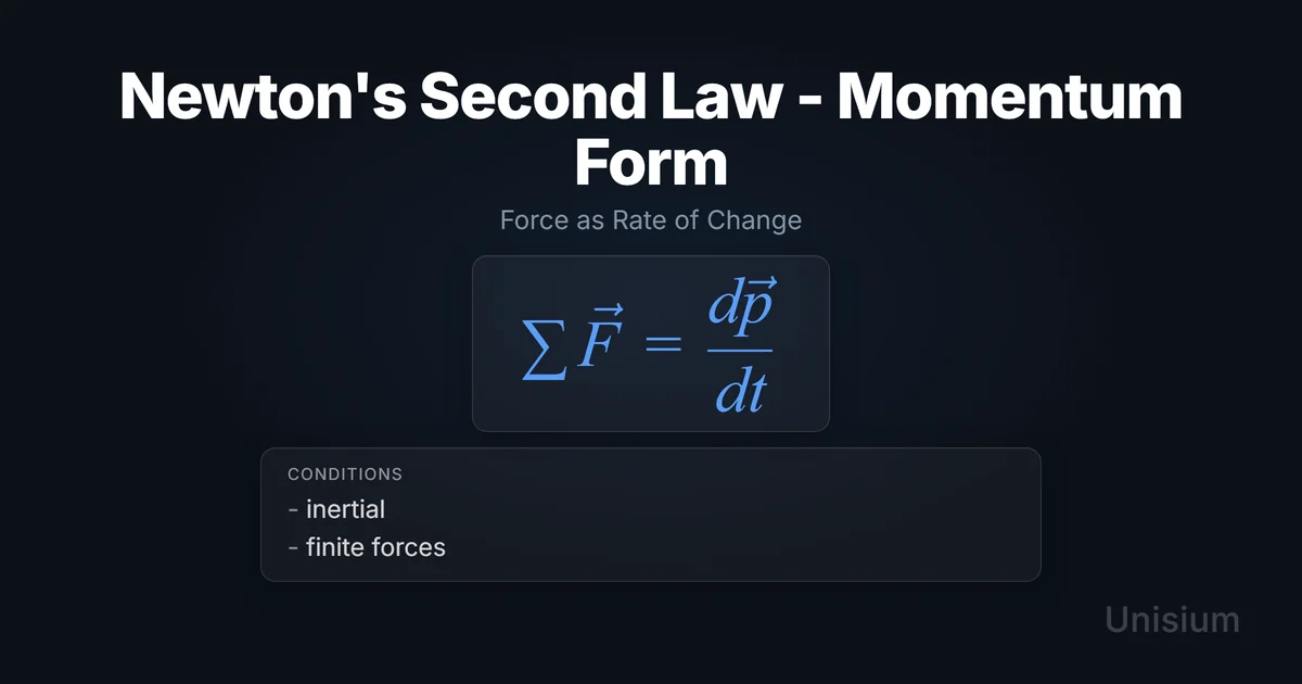 Newton’s Second Law in momentum form says the net external force on a system equals the time rate of change of its momentum: . In an inertial frame with finite forces, it tells you exactly how momentum changes over time and gives a clean bridge to impulse and momentum conservation. Mastering it uses elaboration, retrieval practice, self-explanation, and problem solving in the Unisium Study System.