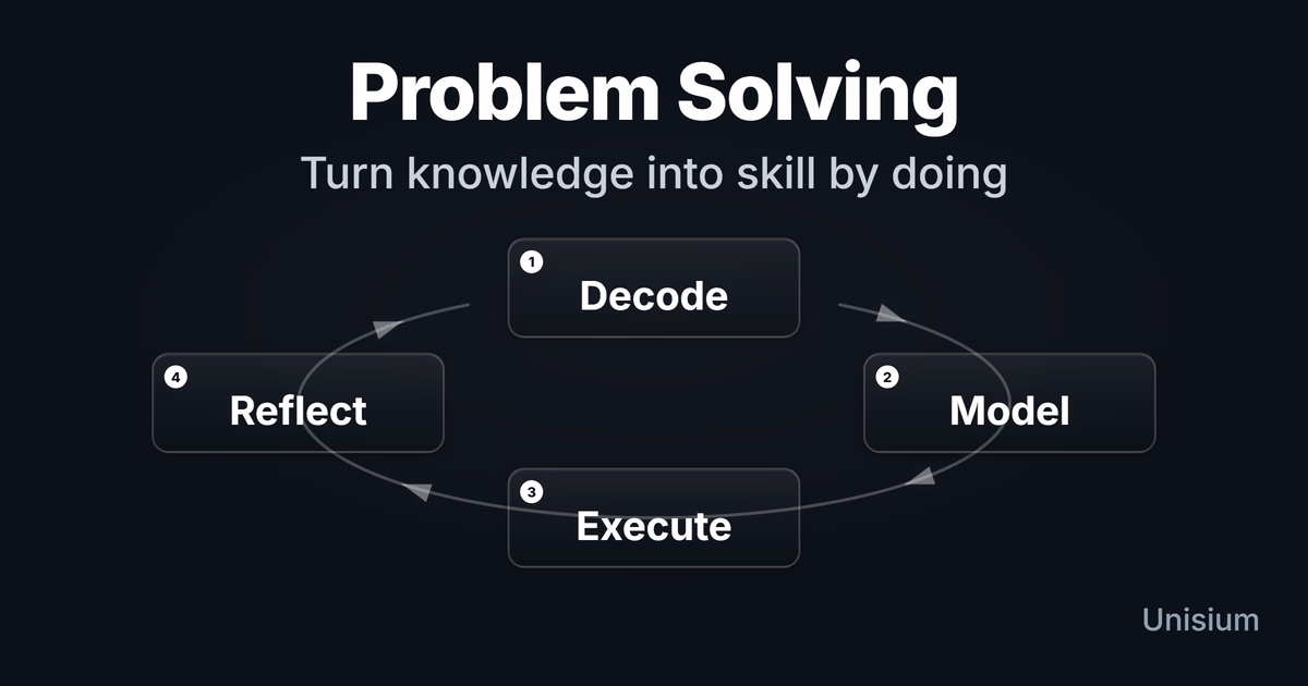 Note: The same logic—decode the situation, model with principles, execute, and reflect—applies to problem solving in programming and other technical domains. Unisium currently focuses on physics and math, but the learning structure carries over.