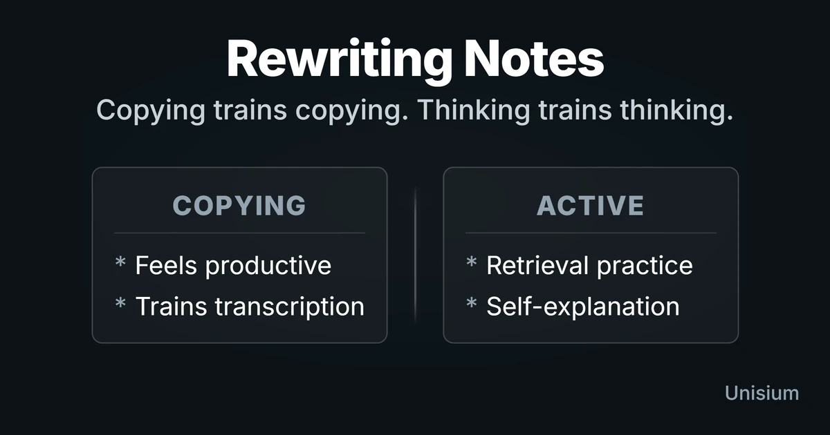 The brutal math: if you spend two hours rewriting notes after each lecture, you could instead spend those same two hours doing targeted practice that moves the needle. The choice is not “rewriting vs. nothing”—it’s “rewriting vs. strategies that work.”