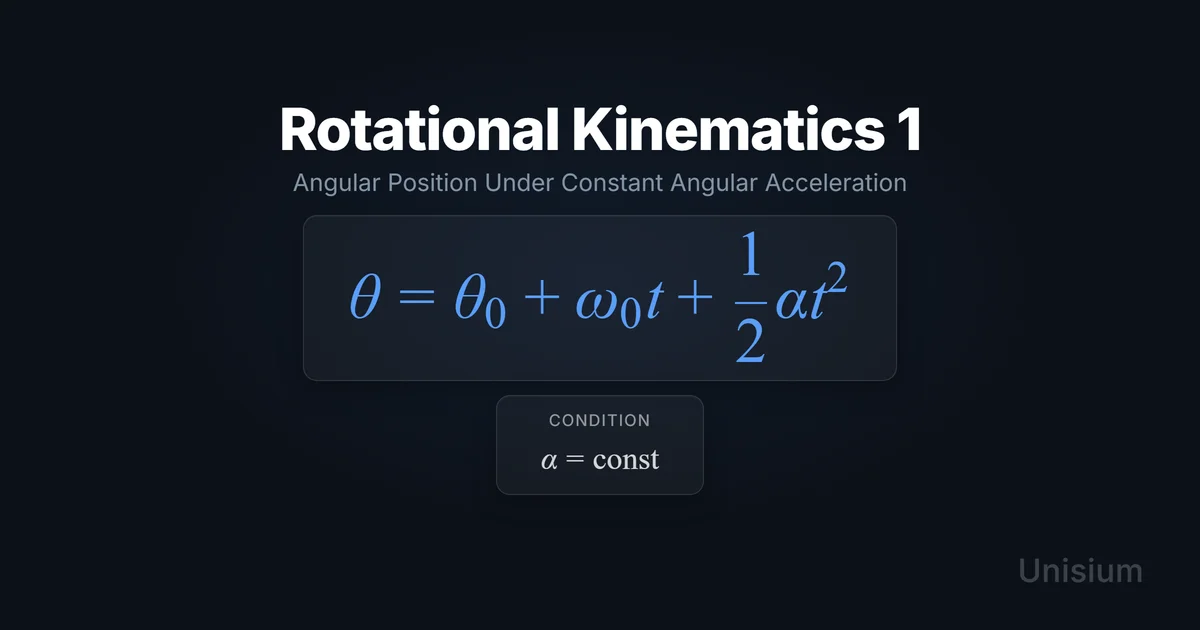 Rotational Kinematics 1 describes the angular position of a rotating object as a function of time when angular acceleration is constant. The equation relates angular position () to initial angular position (), initial angular velocity (), angular acceleration (), and time (). It is the tool for predicting where a rotating object will be after a specific duration under constant angular acceleration—a core principle in the Unisium Study System.