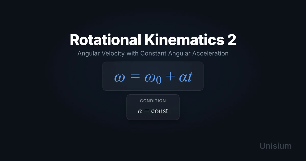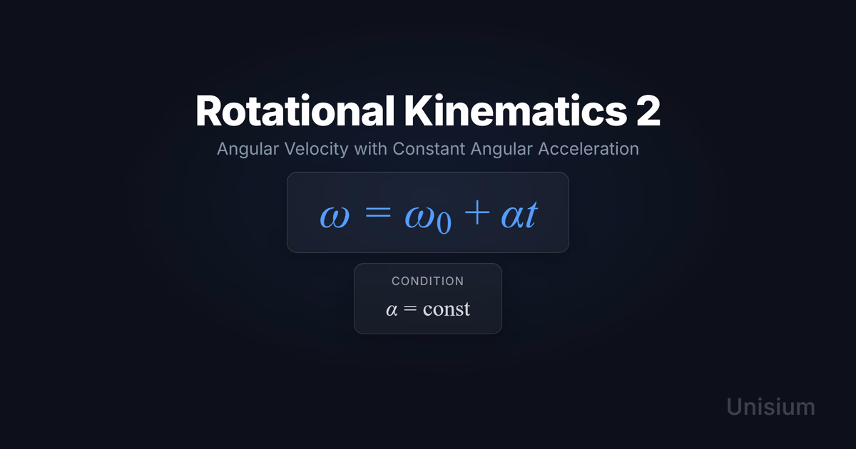 Rotational Kinematics 2 states that angular velocity changes linearly with time under constant angular acceleration: . It applies when is constant over the interval and you’re modeling rotation about a fixed axis with a consistent sign convention. Mastering it requires elaboration, retrieval practice, self-explanation, and problem solving—core strategies in the Unisium Study System.