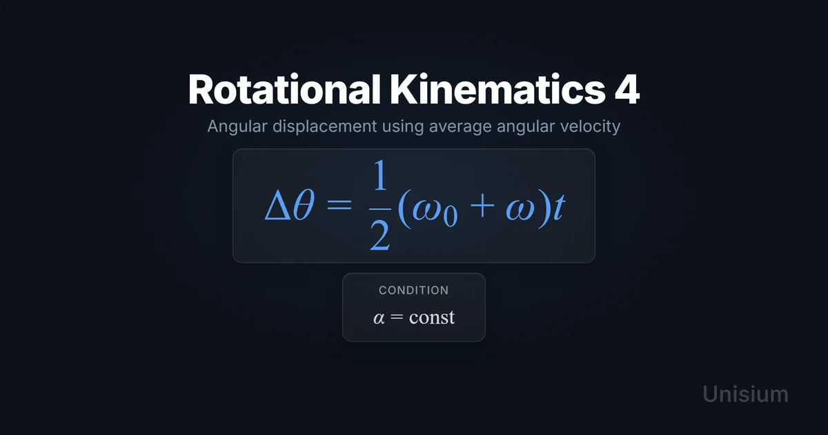 Rotational Kinematics 4 states that, when angular acceleration is constant, the angular displacement over a time interval equals the average of the initial and final angular velocities multiplied by time: . It’s the most direct way to compute when you know , , and but don’t want to solve for . Master it with the Unisium Study System.