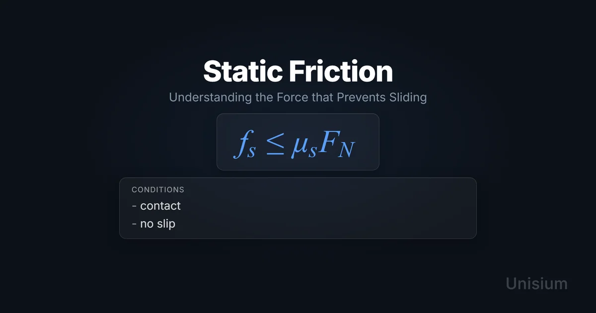 Static friction is the force between surfaces at rest that prevents relative motion. The force adjusts to oppose any applied force up to a maximum value determined by , where is the coefficient of static friction and is the normal force. Mastering it requires elaborative encoding, retrieval practice, self-explanation, and problem solving—core strategies in the Unisium Study System.