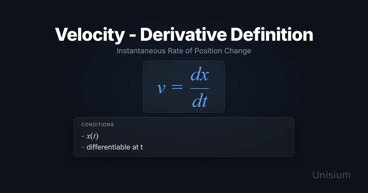 Velocity - Derivative Definition states that instantaneous velocity is the time derivative of position: . It applies when the position function is differentiable at the time of interest. The sign of encodes direction along your chosen axis, so tracking sign conventions is essential—practice it with elaboration, retrieval practice, self-explanation, and problem solving in the Unisium Study System.