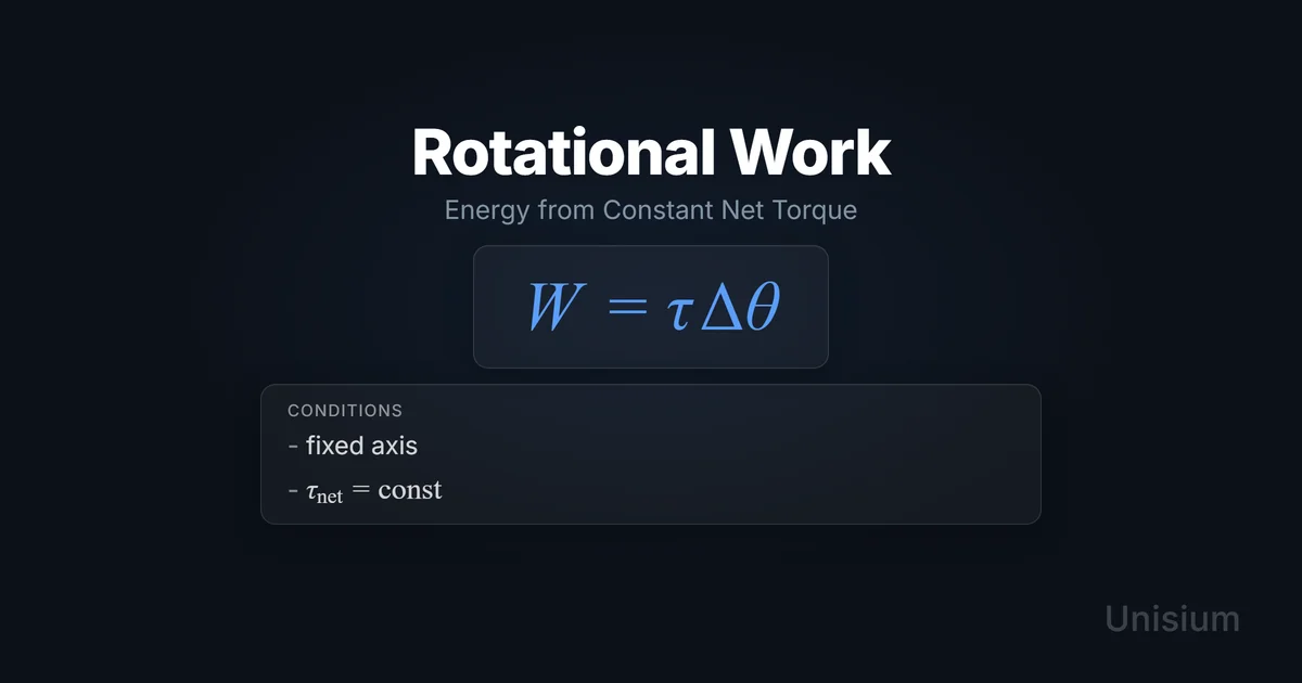 Work in rotation quantifies energy transfer when a constant net torque causes angular displacement about a fixed axis. The equation applies when the net torque remains constant and rotation occurs about a fixed axis. Mastering it requires elaboration, retrieval practice, self-explanation, and problem solving—core strategies in the Unisium Study System.